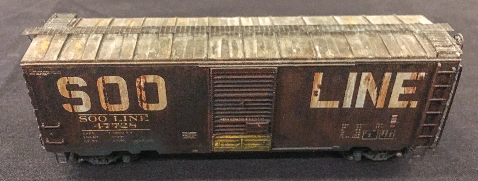 | This heavily weathered Soo box car represents a company service car modeled by Tom Dowling |
