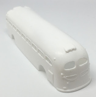 A few months back, I saw an announcement for this interesting HO scale bus from Small Wonders (a Sylvan Scale Models affiliated company.) I ordered one from a seller on ebay a couple weeks ago. It's a classic late Steam to Diesel era bus. They were used in longer haul service as well as typical municipal transit. The site Coachbuilt has a fairly good history of the General American Aerocoach buses. I have already decided to decorate mine for a fictitious southern Oregon regional bus line serving towns between Ashland and Grants Pass (unless I find good information about an actual bus line that operated this prototype in that area, at that time.)